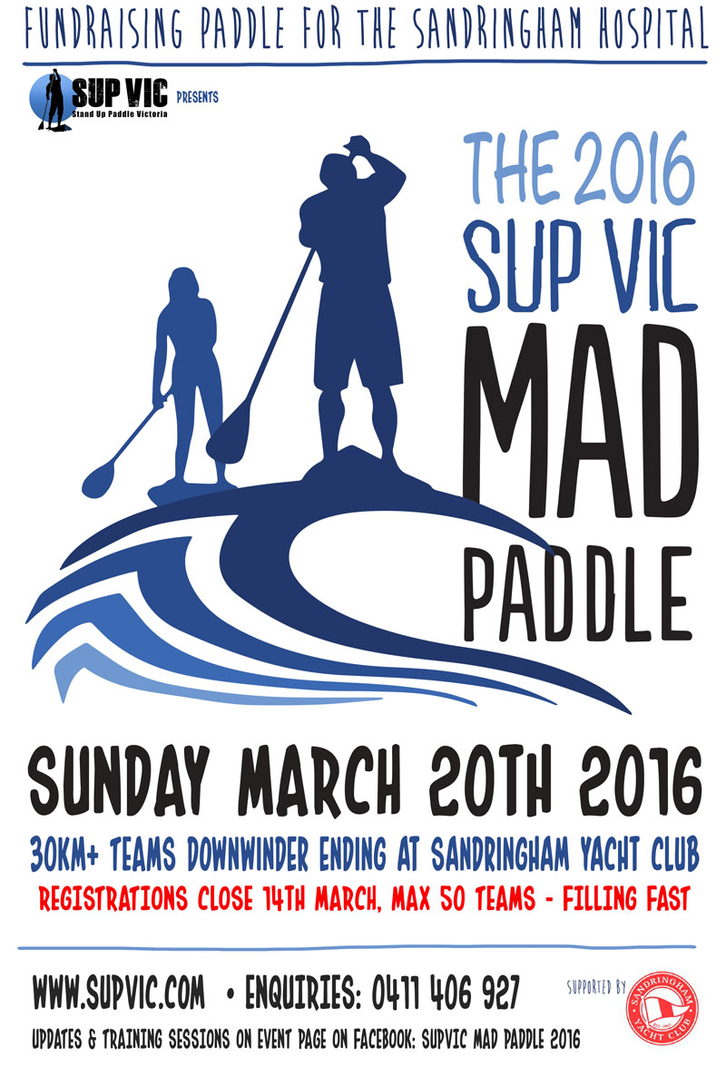 The Mad Paddle is back for the 3rd time, raising funds for Sandringham Hospital. This paddle across the bay is a non-competitive fundraising event, finishing at Sandringham Yacht Club, and features paddlers raising money and paddling with escort boats for a day of satisfying fun and friendship.